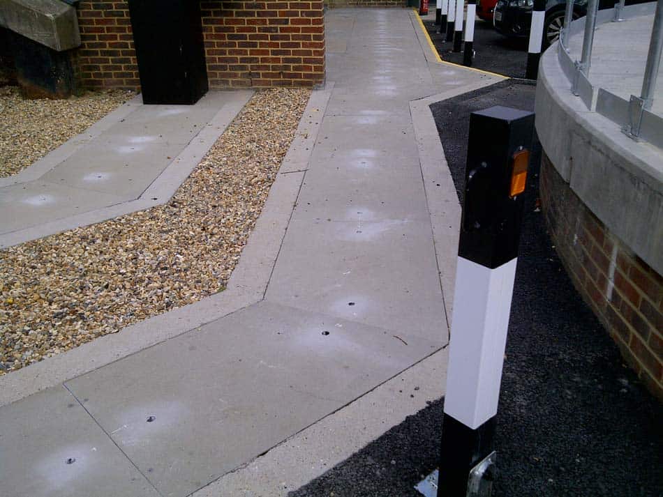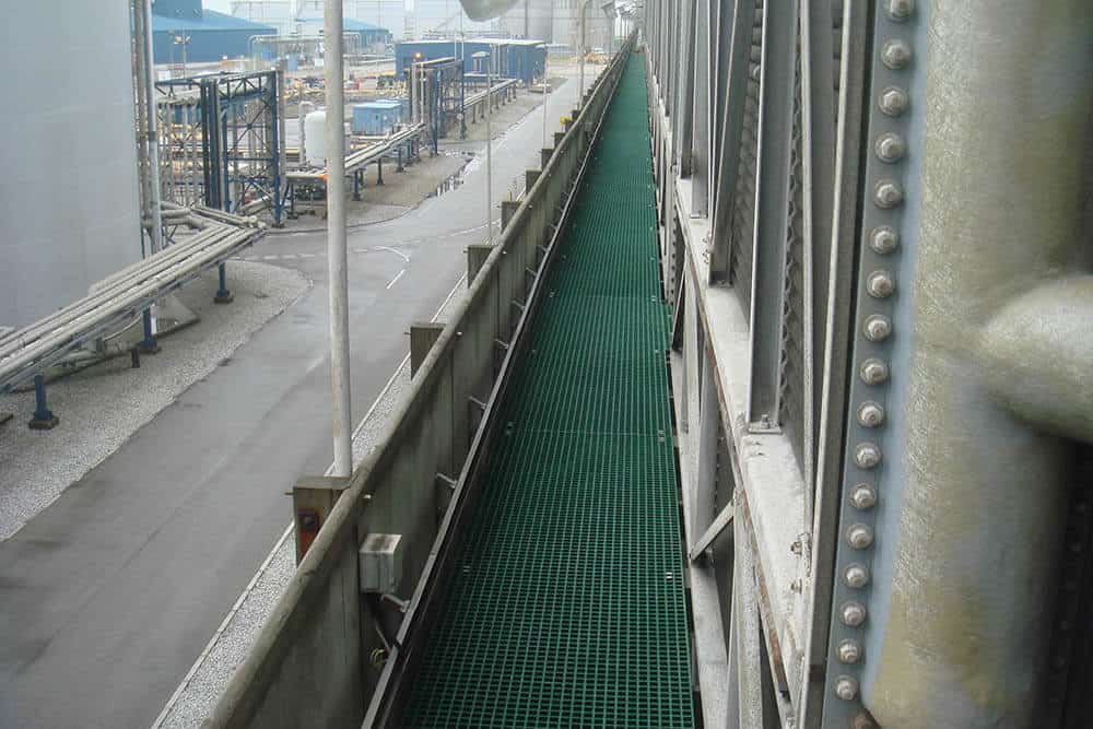The resin forms the flesh of the grid, whilst continuous inert glass-fibre strands are layered in under tension to provide the bone structure. This endows the finished panel with excellent load bearing and impact resistant properties. The walking surface of the grid has a coarse grit bonded into it to ensure a good grip – even in greasy areas.